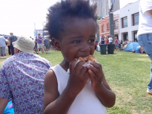 Today we went for a short lunch-time visit to see the brass band and of course, Tin had to whip out the trumpet to play with them. An admirer brought him a glazed donut after he finished his jambalaya lunch and it was love at first bite and a lot of booty shaking afterwards.