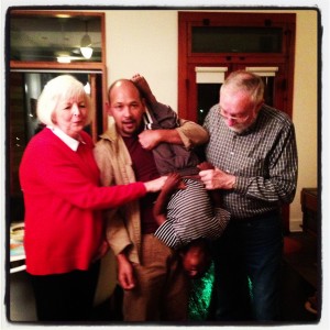 Tonight, instead, we had a special visit from Tin’s godfather’s parents, who came as they always do, bearing gifts – answering the question of what to do on the 9th night of Hanukkah – have visitors!
