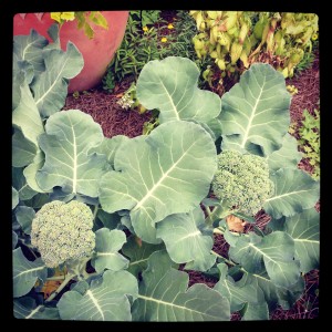 Saturday we feasted on the bounty of our garden. We cut a big thick stalk of broccoli, we picked mustard greens, we harvested the last of the basil and we made a delicious lunch. Sauteed onion with greens, steamed broccoli, and pasta pesto with brown rice pasta. Yum.