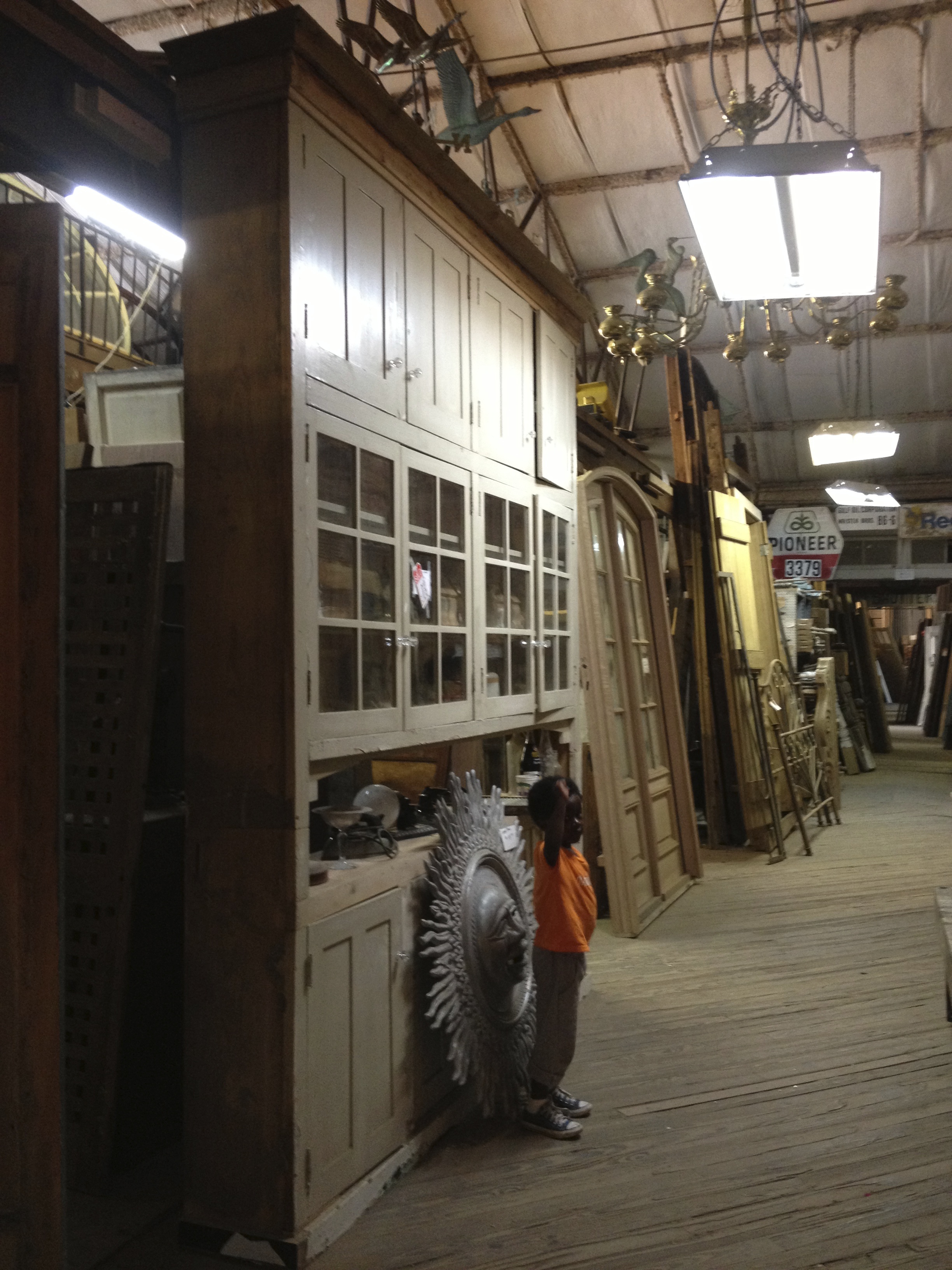 Yesterday, I stopped into Ricca’s, which forever was a mecca of everything worth salvaging from the architecture of New Orleans. Only, after the 2005 Federal Flood a lot of what we have salvaged was destroyed, so only now are there pieces showing up here and there. I went to find out about shutters as I have none on my twelve large windows and we are in the midst of hurricane season. If I had to evacuate, I would have to board up the windows. Then there it was – waaaa waaaa waaaa – calling to me – The cypress cupboard that fits perfectly in my kitchen, which was removed from a kitchen uptown on Robert and St. Charles because the family was upgrading – another woman’s trash, my treasure: