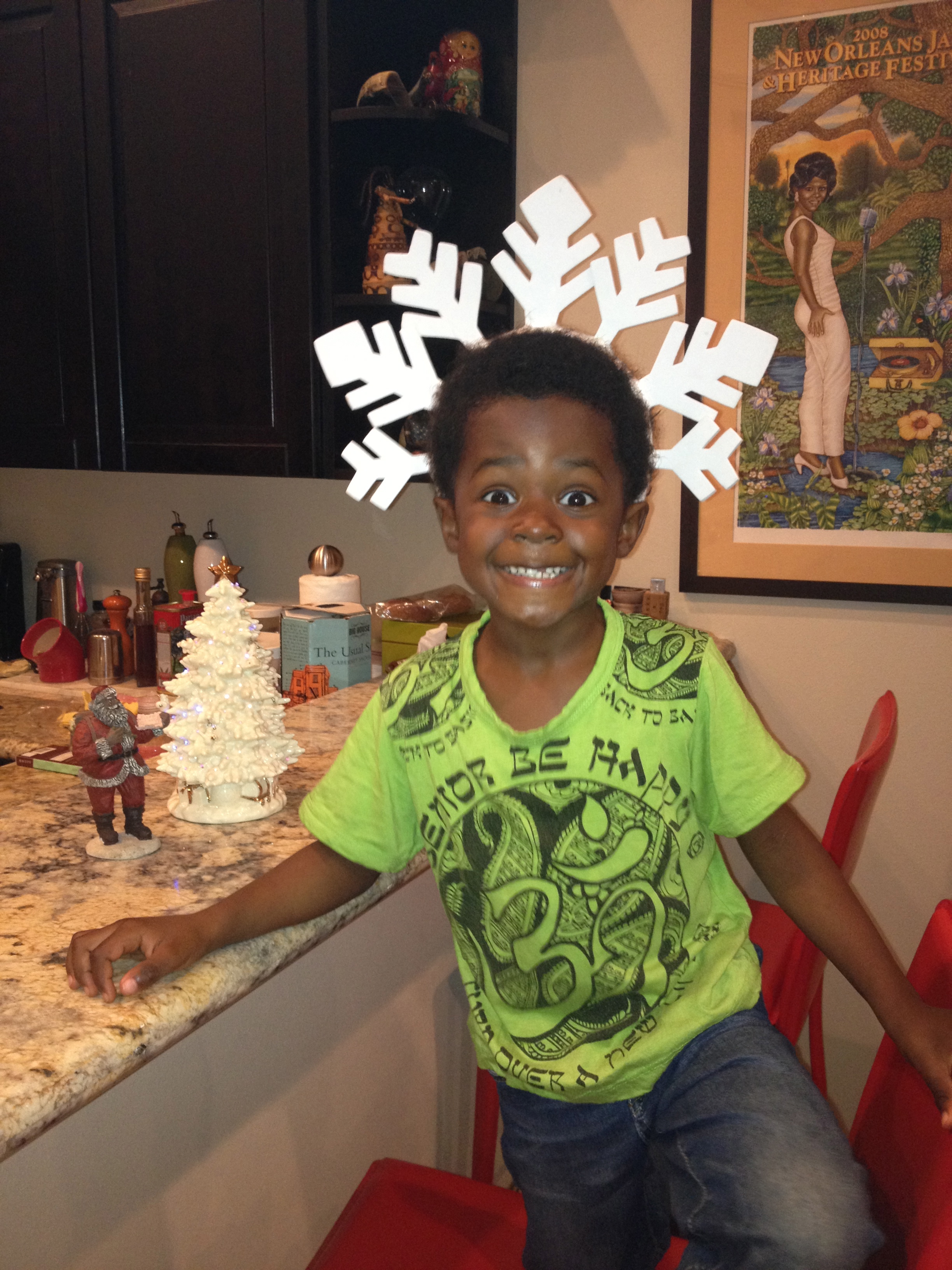 The Hanukkah decorations came down, the Santa stockings came out (Santa does visit Jewish boys and girls), and now the Kwanzaa table with its red, green and black colors is taking form. But first we pause for the Homecoming Anniversary. Tomorrow will be four years since the first day I laid eyes on Tin. In four years, my life has stretched to dimensions heretofore unknown – yes, this is parenthood and it’s a daily miracle.