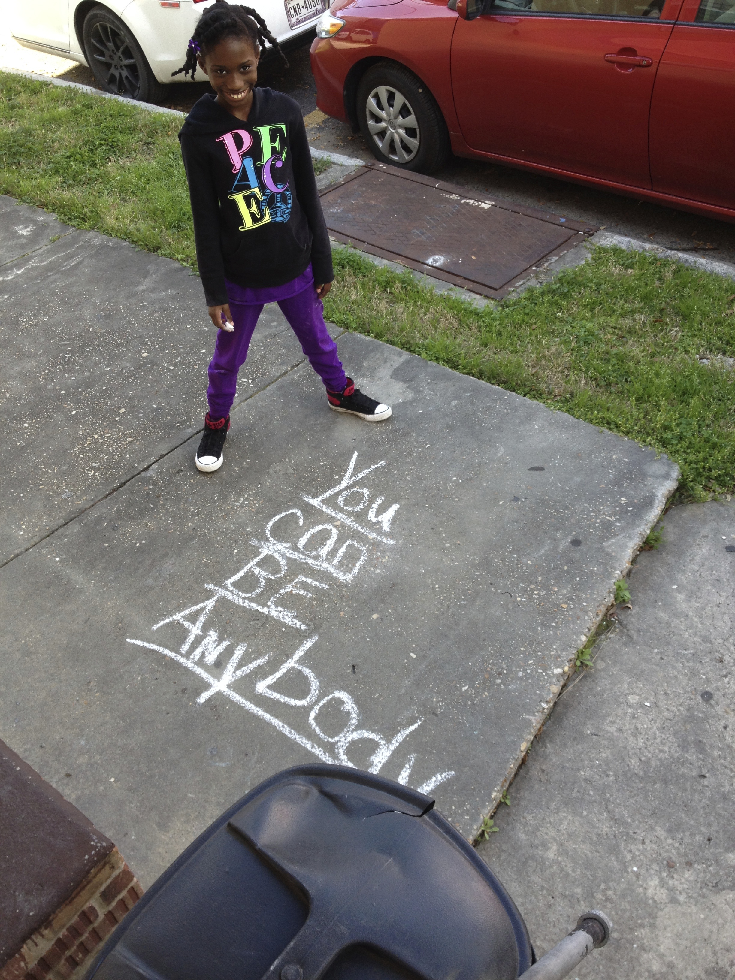 A box full of colored chalk and markers kept the children busy under our legs while us adults sat and enjoyed the spectacle of a beautiful day, drinking wine, eating moros y cristianos, and chatting away about this and that. When the parade began to roll, you could hear the thunder of the marching bands and the crowd going nuts – and friends brought Tin with the other kids back and forth to the parade, returning with armfuls and bagfuls of booty – beads, frisbees, lighted sticks, stuffed animals.