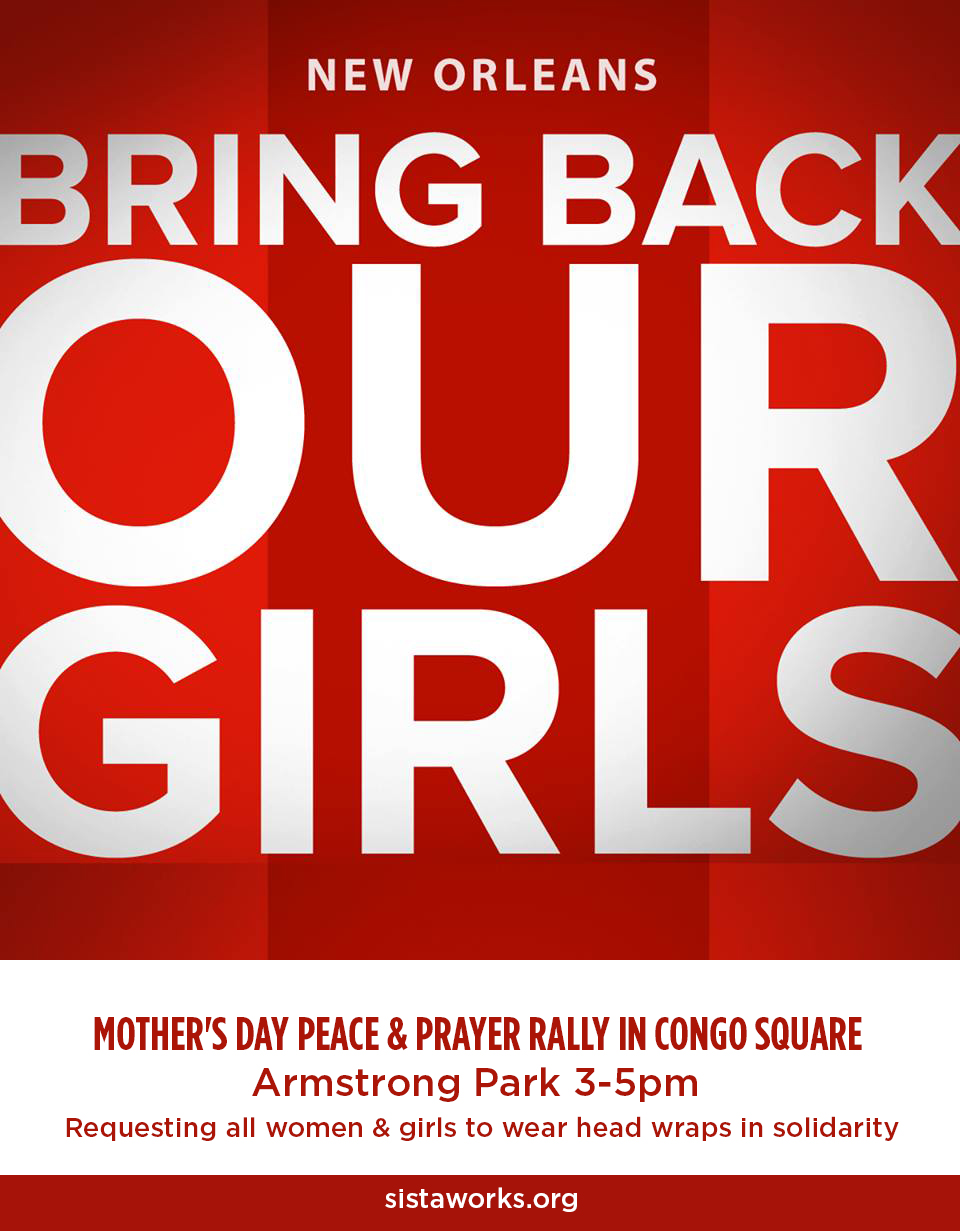 I’m helping a rally in Congo Square this Sunday for Mother’s Day for the Kidnapped Nigerian girls – I hope everyone comes out to show their support and solidarity with these mothers and daughters and Nigerian community.