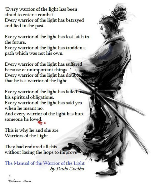 In my late night confessions, I have admitted to being a Warrior of the Light. You see, you have to be a warrior, to actually see the light – it’s in the manual.