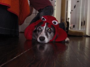 Thursday is the dog parade starting at Cabrini and headed to Swirl. Friday is Halloween. We’re thinking Loca will be Obama and mom suggested that Arlene be Toots, his grandmother. But in the meantime, we were trying some costumes a friend dropped off. The spider did not fit Loca at all. And the lobster, well, Arlene just was too sad of a lobster to take her out like that: