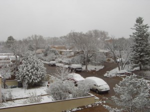 We’re lounging for the lord this morning, listening first to Bach on the IPod and now to a God playlist (every song mentions God, I put this together for an Easter long ago). Emmylou Harris’ Western Wall is playing. I’d go out and get some firewood and build a nice roaring Sunday spiritual fire, only we’re supposed to be headed to Taos but instead we’re looking outside at a winter wonderland.
