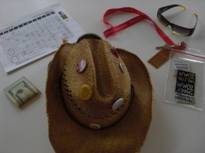 Main Jazz Fest paraphernalia April 25, 2009 by Rachel Below are Jazz Fest essentials – a good hat that you can add flourishes to that actually blocks the sun, a Brass Pass from WWOZ, cash, schedule, sunglasses.