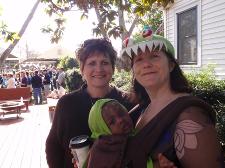 Well I love most parades but Endymion, which is weird, it’s the mondo, super duper, huge mega parade right here in my neighborhood and it is one of the ones I am least interested in. As a matter of fact, we’re headed uptown to see Toth tomorrow, which is a total neighborhood parade and always fun. But Endymion as I have said before invites the sort of people I don’t want to be hanging out with – they are territorial, armed with tarps and ladders, and basically unfriendly to our hood. Anyway, despite that, we all three went and marched with the Morris Jeff school handing out brochures to anyone with young kids to spread awareness. Tin and I dressed like dragons, sort of, and he got his face painted with purple, green and gold polka dots.