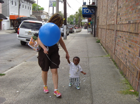We had to stop off and pick up a birthday gift so we bought him a balloon since his birthday balloon got caught up in the ceiling fan. He loves it! The woman at the Magic Box said, “All children love balloons.” As if that was supposed to in any way diminish what our son felt about this big fat blue balloon.