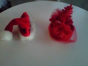 I was flipping through an INSTYLE magazine and reading about how a stylist gave an actress her beach hair look by blowdrying over a loofah and then how high-waisted blue jeans are making a come back (about damn time is all this short-waisted woman has to say, I will sing at the funeral of peanut jeans or at least that is what we called them when I was a tween, jeans that barely cover the crack of your butt). But I’m back to be weary of wearing yoga clothes every single day because I work at home and just leave to go exercise or walk the dogs. Like Seinfeld told Costanza when he showed up in sweats, “You’ve just given up haven’t you?” So one thing I decided to do is spruce up my holiday wardrobe and the first thing I did was trade in my santa hat for a true holiday hat, complete with feathers and a bird on top (thanks Cree!) – really when you compare the two, there is no contest: