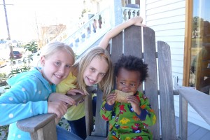 The other day when I was holed up in my office for what seemed like eternity and ran downstairs because I had forgotten to pay the nanny there sat three kids on the front porch soaking up the sun, not a care in the world, eating bread.
