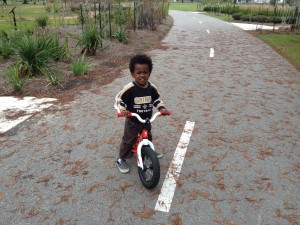 Despite the rainy, cold day, Tin and I went to Big Lake in City Park to take a spin on the bike around the path and then wound up at the playground for some much needed climbing. Just like dogs need to be walked every day – little boys need to run, climb and jump.