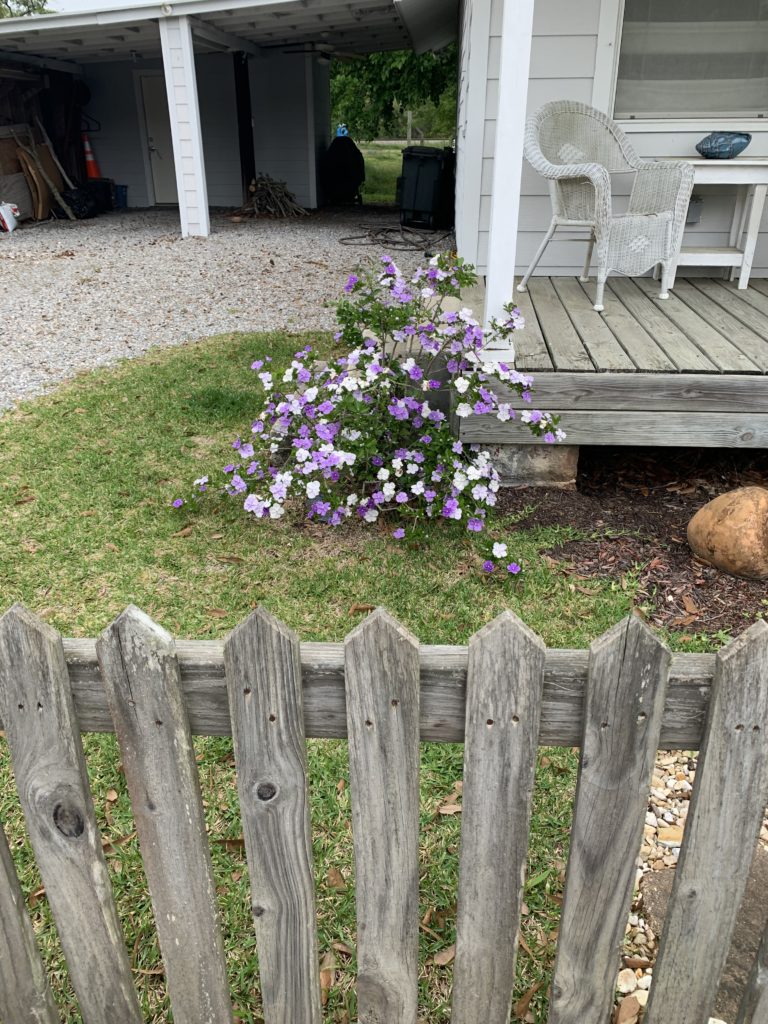 On my walk this morning I saw a yesterday-today-and-tomorrow bush in full bloom. That was exciting. The Brunfelsia pauciflora is a nightshade plant endemic to Brazil – there they call it Kiss Me Quick. The flowers last for three days and change color each day – white, pink and purple.