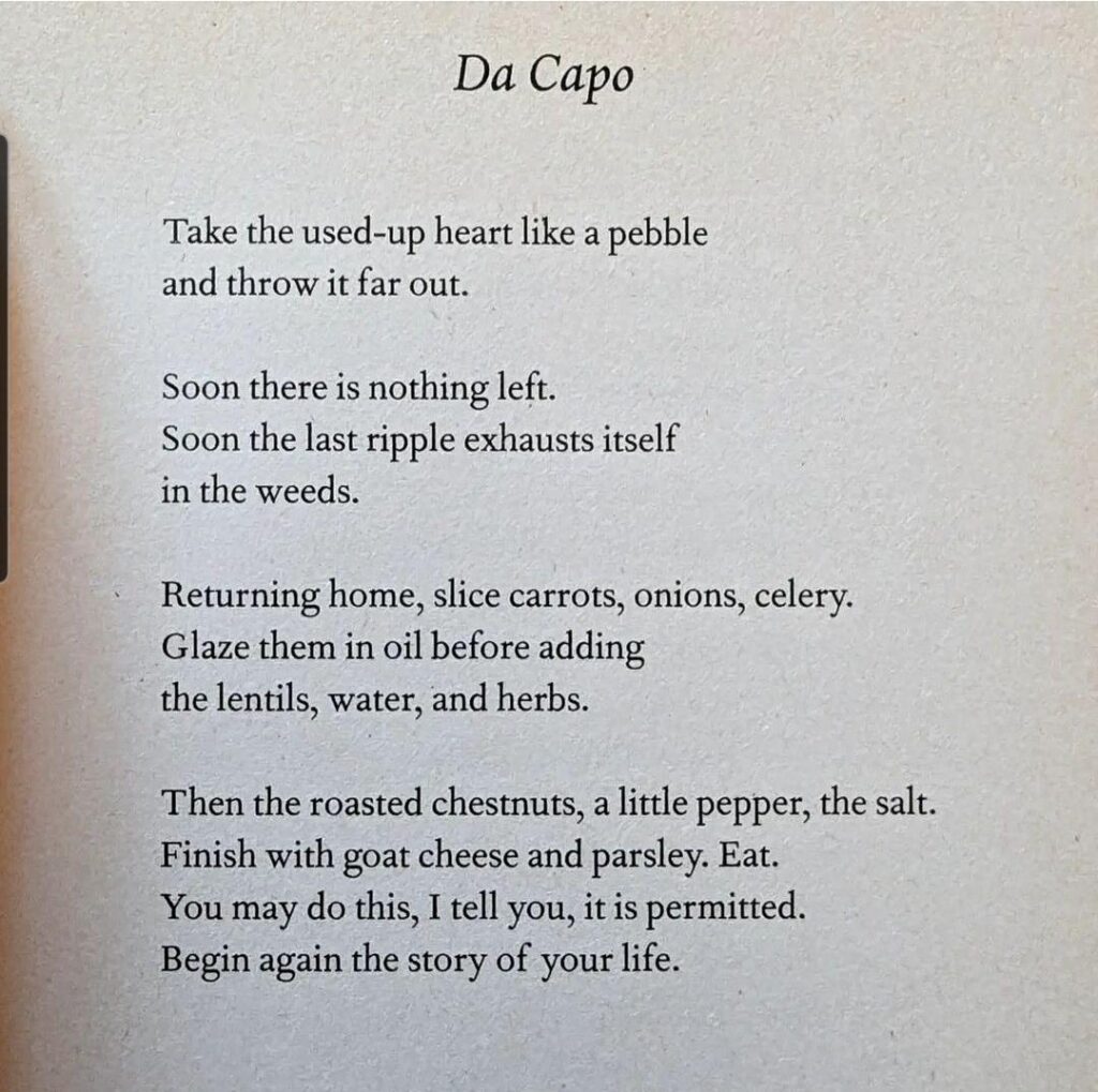 And here is one of my favorite poems, from one of my favorite poets, Jane Hirshfield. I was lucky enough to hear read her poetry in San Francisco and she speaks as she writes, soulfully.