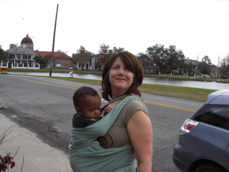 A friend across the bayou came by and gave me her Moby to walk Tin around in, it almost simulates them being in your belly and it holds him real close to me which is a feeling I love. We went out for a walk to hear the wind chimes under the large oak tree by the big lake in City Park. The weather was delightful (not frightful) and Loca came with us. We stood under the chimes and listened to their music in the gentle breeze and Tin looked up at the huge hanging chimes and I looked down at him and I felt like I was having an out of body experience. Magical.