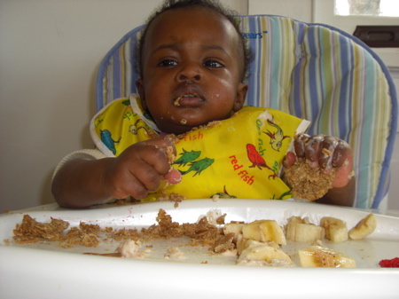We’ve given up on trying to push any sort of food on Tin. He’s on his own over there in the big high chair. But if he had his druthers he’d never eat anything but a whole grain waffle, half a banana and a half scrambled egg. So every day we try something new. And blech is all I got to say.