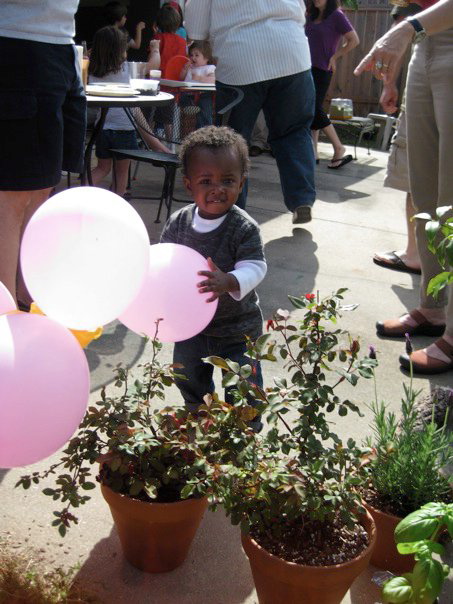 For Tin it is balloons. He can spot a balloon a mile away. These are pink balloons he usurped from his friend’s 4 year old birthday party: