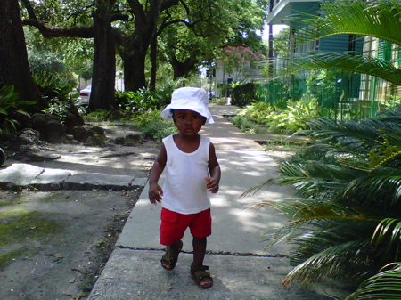 On the way out, an elderly African American woman said to her table folks, “She should put a shirt on that boy,” as Tin was wearing only a wife beater. But I was wearing a matching one in pink and no one commented about my tank top. Walking home on Esplanade, once past Claiborne, I put Tin down so he could walk off his big meal. He was centered again, and so was I.