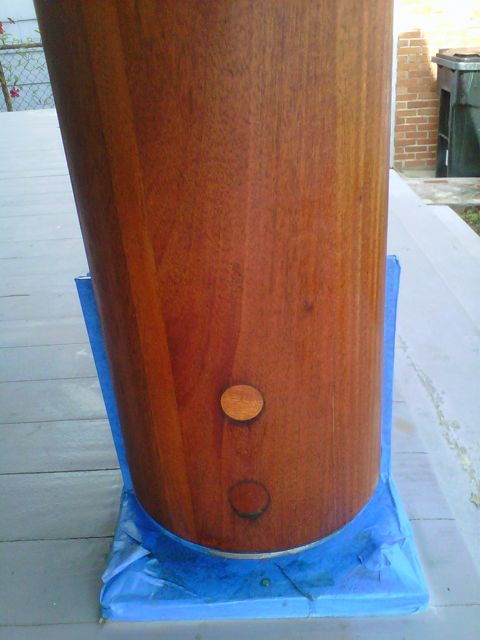 So the columns have been sanded, sterilized to stop the mold that got in from the breakdown of the finish, and now the hardware has been replaced and the holes have been plugged. Don’t ask what this is going to cost.